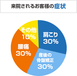 お悩み別では肩こり、腰痛、膝の痛みなど慢性症状、猫背、産後の不調、骨盤矯正から坐骨神経痛、スポーツでのお悩み、自律神経失調症など重い不調の方もいらっしゃいます。